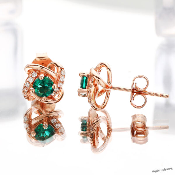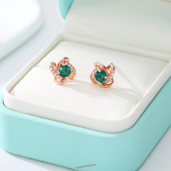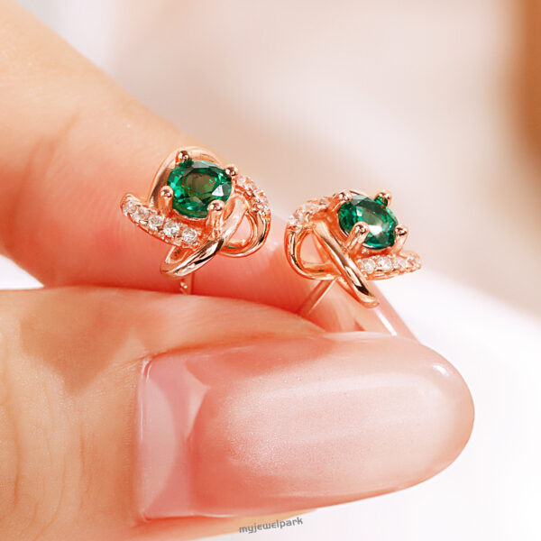 These 18K rose gold vintage-inspired stud earrings feature lab-grown emeralds wrapped in a swirl of sparkle that feels both timeless and fresh. The warm rose gold hugs each vivid green stone, creating a look that’s soft yet striking—perfect for dressing up your everyday or adding a romantic touch to evenings out. Think of them as your go-to when you want compliments to keep coming.