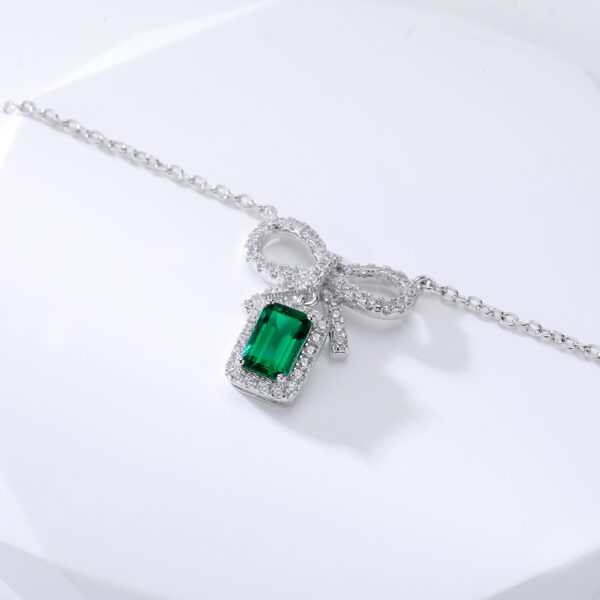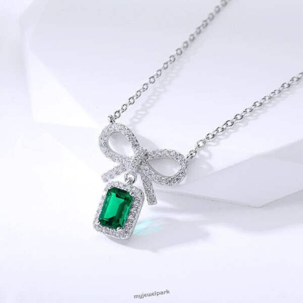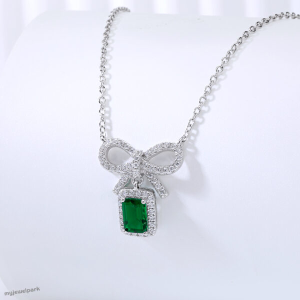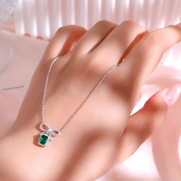 18K White Gold 1.05ct Emerald Cut Bow Pendant Necklace Lab Grown Emerald