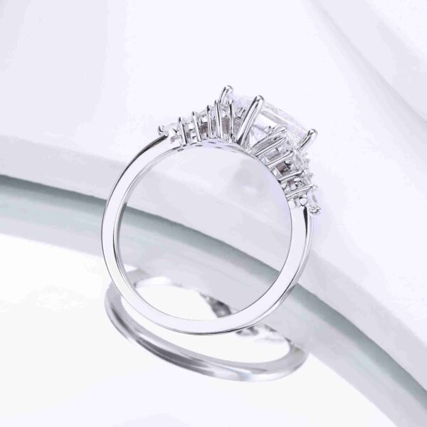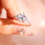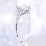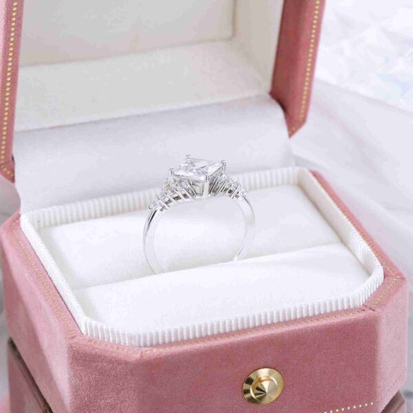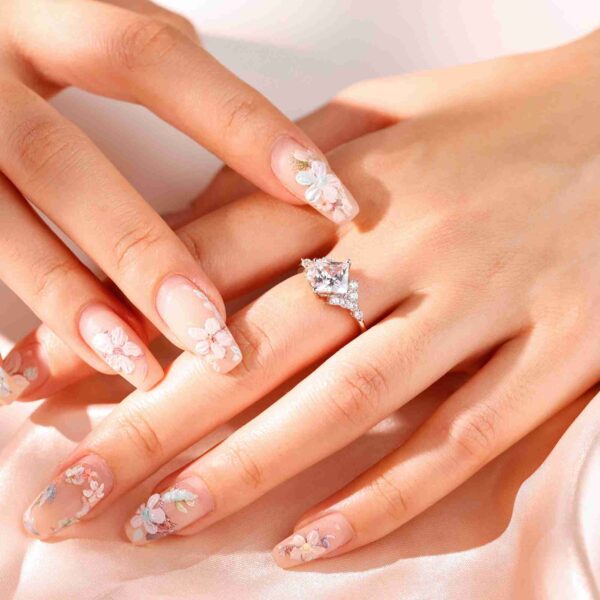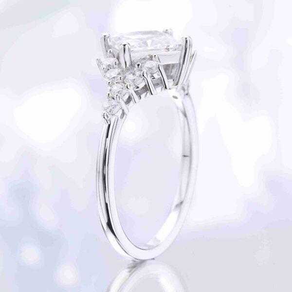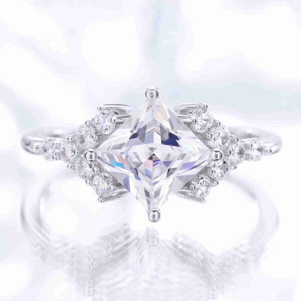 On this ring, a 2.08 carat princess cut diamond radiates crisp brilliance, framed by a graceful cluster of D–E color VVS–VS accent diamonds. Precise symmetry and refined craftsmanship enhance the stone’s modern elegance and luminous presence.