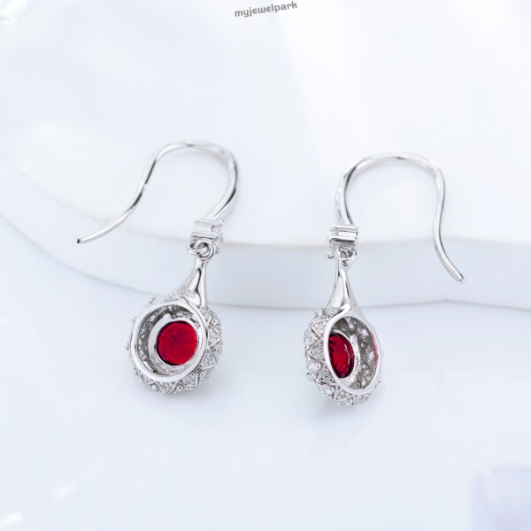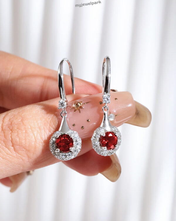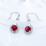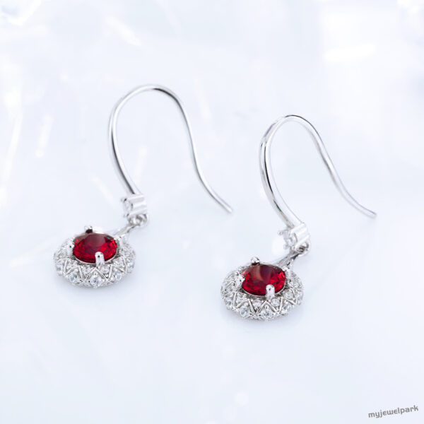 These 18K white gold ruby halo dangle earrings are pure romance with a bold twist. The lab-grown rubies glow with a passionate, fiery red—perfect for adding warmth and confidence to any look. Surrounded by a sparkling diamond halo, they catch the light effortlessly with every move.