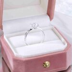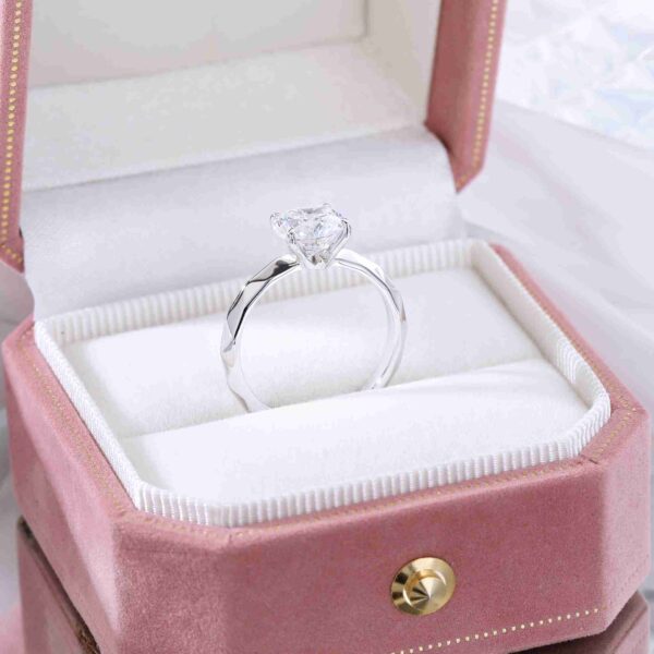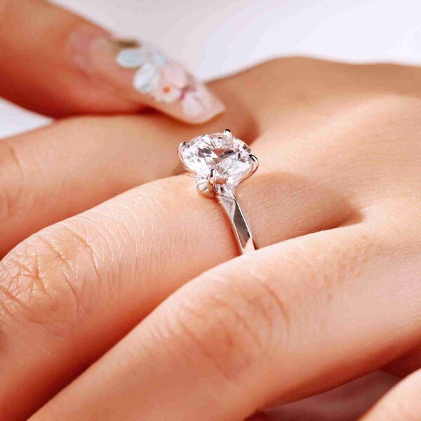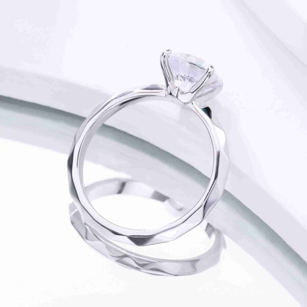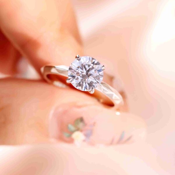 On this ring, a 1 carat round brilliant diamond is held in a refined four prong setting, crafted in gold plated 925 sterling silver. The balanced design enhances light return, expressing understated elegance and everyday sophistication.