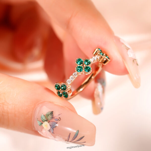 This little clover is pure joy in a ring. Set with vibrant green emeralds and soft sparkle, it feels lucky, lovely, and full of charm. Perfect for layering or wearing solo when you need a touch of magic.
