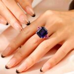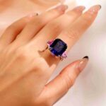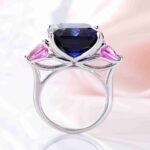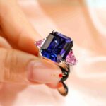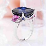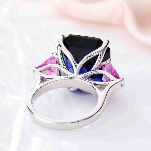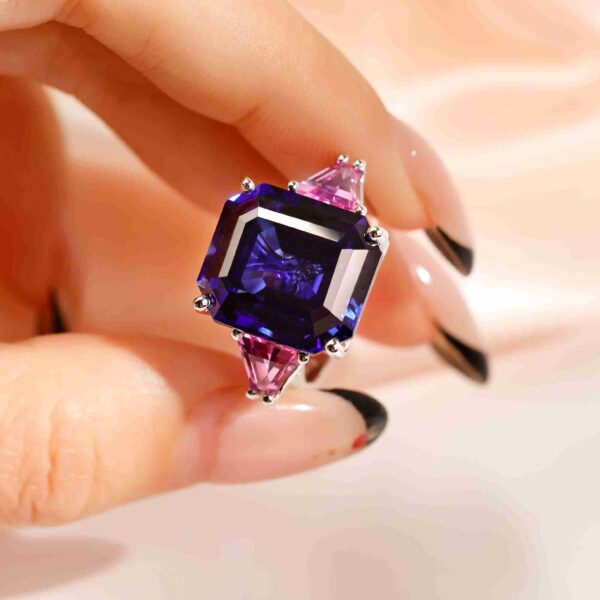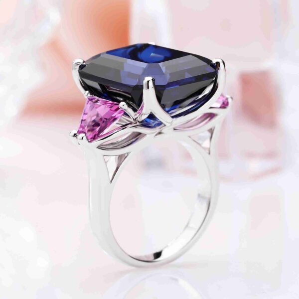 In this ring, one 5.32ct Asscher-cut blue sapphire reveals deep, mirror-like brilliance, flanked by tapered pink baguette accents. The balanced trilogy design draws the eye to the center stone, enhancing its rich color and refined geometric presence.
