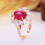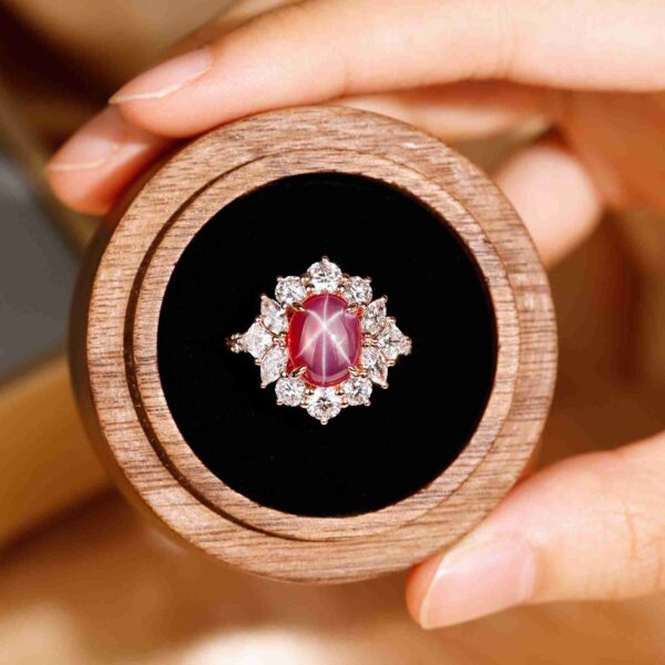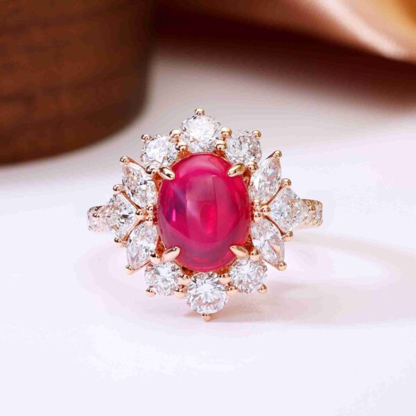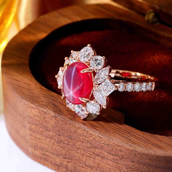 In this ring, one cabochon star ruby reveals a soft, celestial glow, framed by a marquise halo that enhances its natural phenomenon. The warm rose gold setting and balanced symmetry are designed to emphasize the gem’s quiet yet captivating brilliance.
