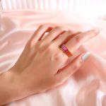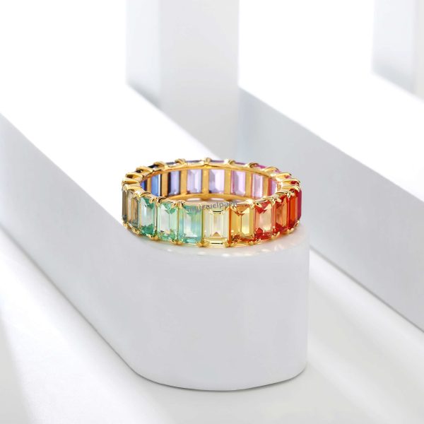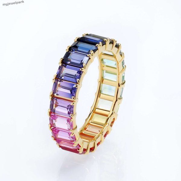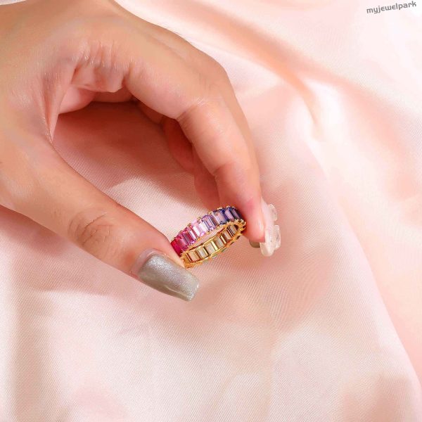 The colorful gemstones in this ring are arranged closely and continuously, forming a color spectrum that surrounds the finger, making the whole piece of jewelry both modern and warm and romantic.