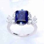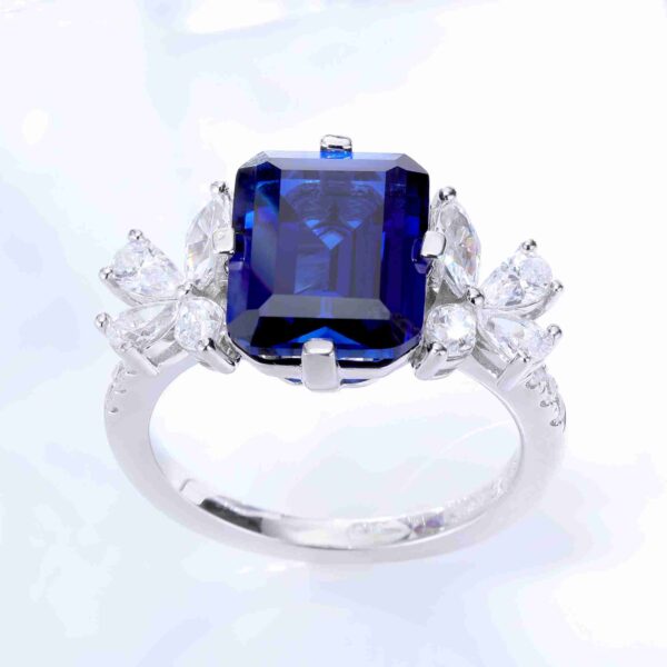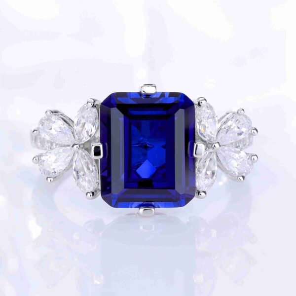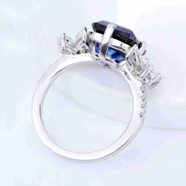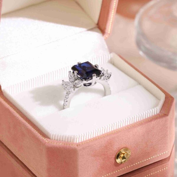 Emerald Cut Royal Blue Sapphire Trilogy Petal Diamond Ring