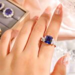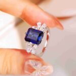 In this ring, a 7.62ct emerald-cut royal blue sapphire reveals deep, velvety color at its heart. Petal-shaped diamond accents unfold at the sides, their delicate symmetry enhancing the sapphire’s calm, regal presence.