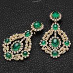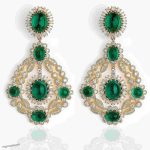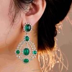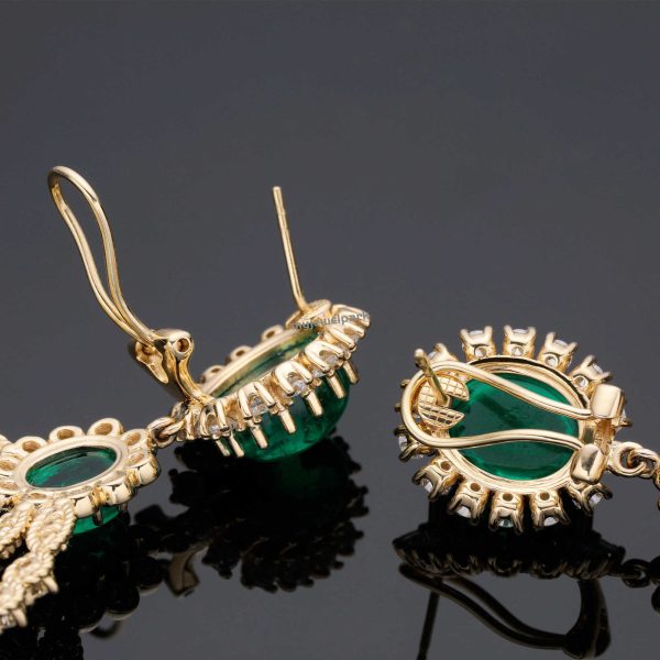 The emeralds are cradled by a halo of micro-pavé diamonds, their shimmering brilliance enhancing the rich green centerpieces. The intricate setting, designed to maximize light reflection, ensures that every movement is accompanied by a dazzling display of sparkle. The earrings feature a delicate yet secure clasp, ensuring they grace your ears with comfort throughout any occasion.