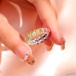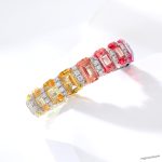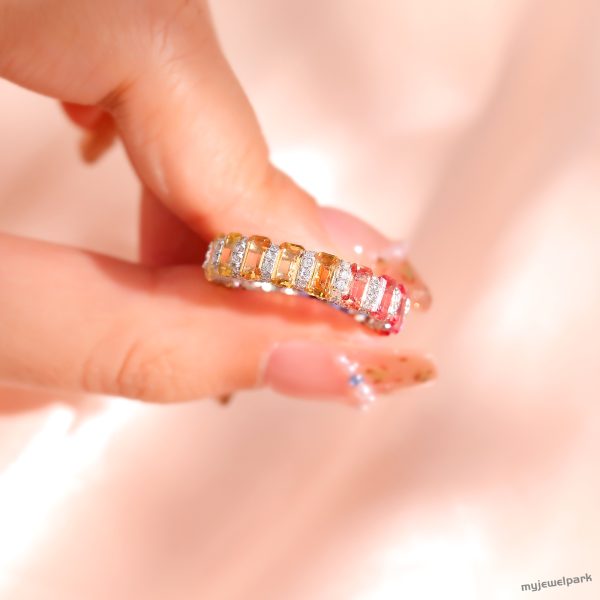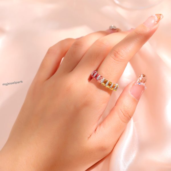 This rectangular lab-grown colored sapphire ring is quite charming. It uses lab-grown colored sapphires with bright and diverse colors, and each rectangular gem is carefully cut to show the brilliance of the gem. Small diamonds are also inlaid around the ring to make it more luxurious. Lab-grown gemstones are cost-effective, and you can own high-quality jewelry at a more affordable price. Whether it is worn daily or for special occasions, this ring can make you radiant and show your unique taste.