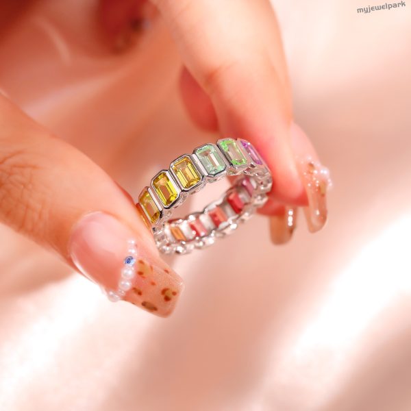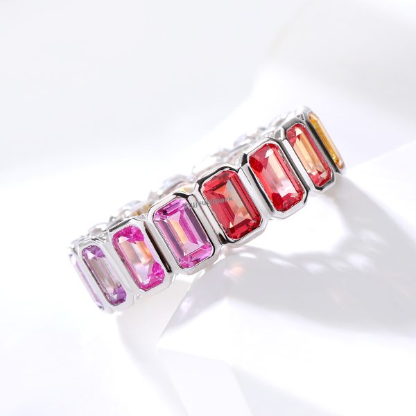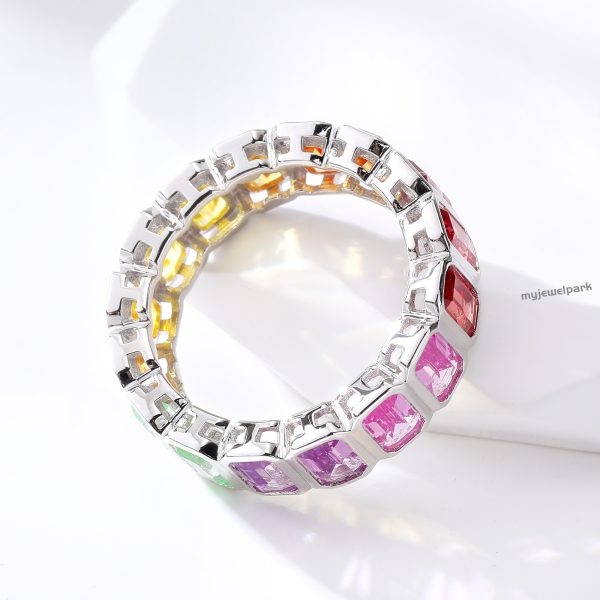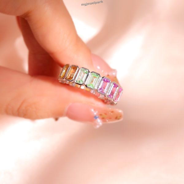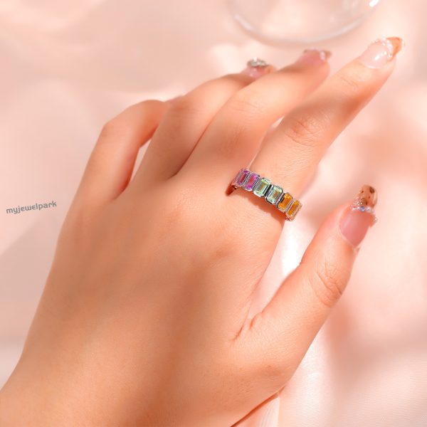 This ring is a charming rectangular lab-grown colored sapphire ring. The colored sapphires are colorful and as gorgeous as the rainbow, and each one is carefully cut to present an elegant rectangular outline. Lab-grown gemstones are cost-effective, allowing you to own high-quality jewelry without breaking the bank. This ring is not only suitable for daily wear, but also can show your unique taste on special occasions. It is a perfect combination of style and value that you will love.