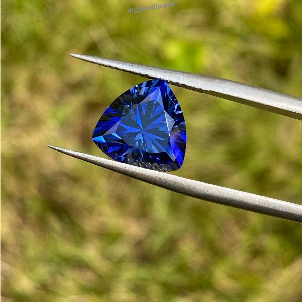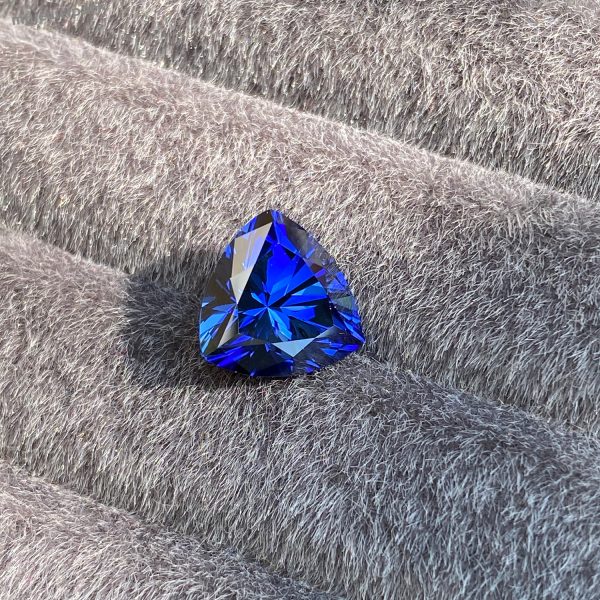 This is a round triangle lab-grown royal sapphire. The round triangle cut is a unique and creative gem cutting method. It combines the advantages of the round and the triangle, retaining the curve beauty of the round and adding the sharp edges of the triangle. This cutting method greatly enhances the fire effect of the gem, forming a dazzling and glittering effect. Due to its special shape and structure, this gem also has a unique dynamic beauty, as if it is changing its posture at any time. Its unique shape allows designers to give full play to their unlimited imagination and create more novel and interesting necklace styles.