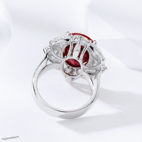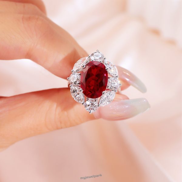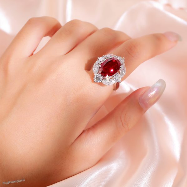 The bright color of the big red gemstone and the pure light of the white gemstone create a gorgeous yet simple beauty. The arched design on the ring arm and the embellishment of the larger gemstone in the middle add a unique personality charm.